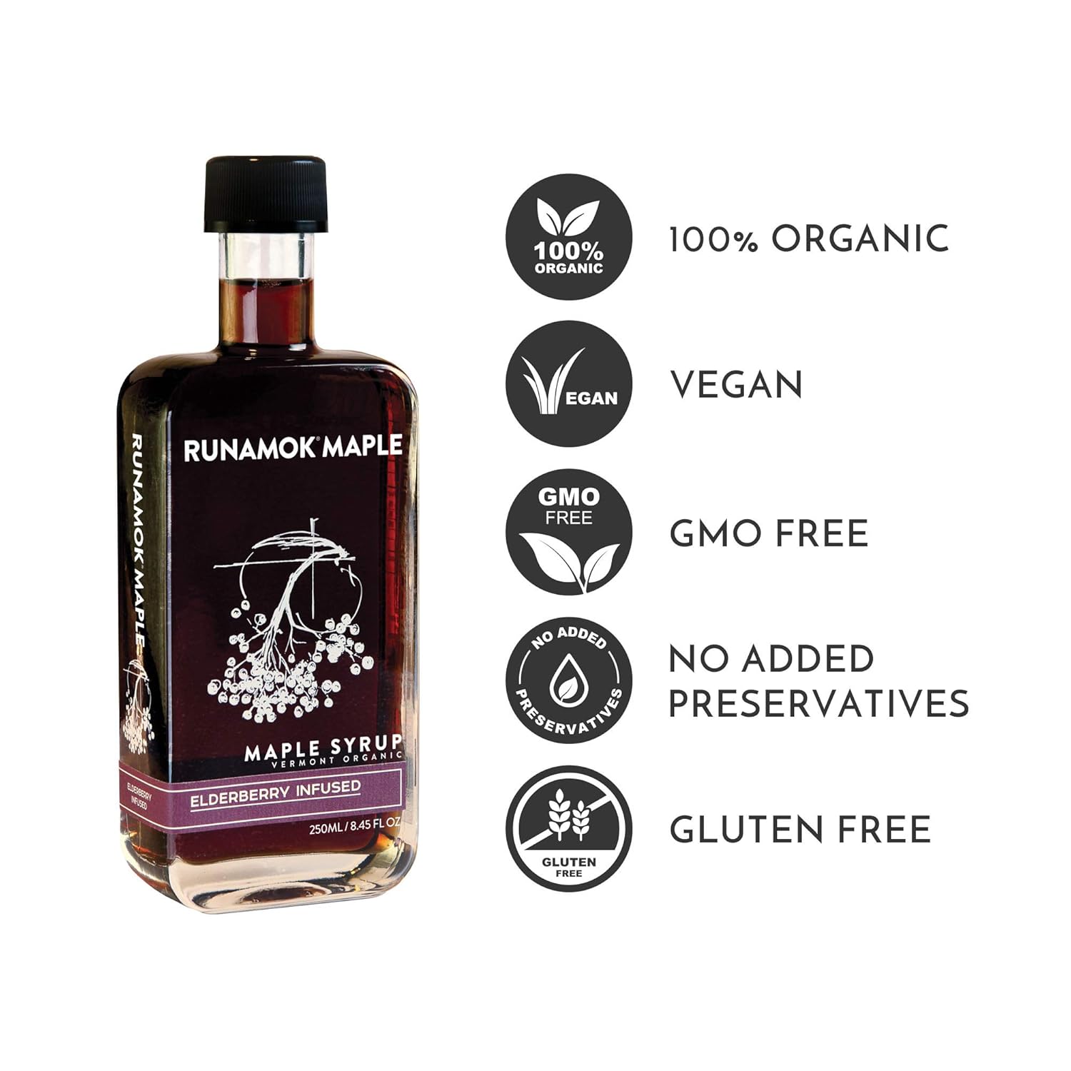 It contains a high dose of 4 grams of Black Elderberries to strengthen immunity. Elderberry Infused Maple Syrup. Our pure maple syrup is infused with the finest elderberries resulting in a woodsy taste with the sweetness of figs and maple.